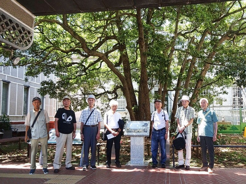 約1時間で展示室1,2を見て回ったが、この資料館の正面から入ったところの中庭に名物の「たまくすの木」がある。クスノキ科の常緑樹で高さ12m、幅は8mを超える。ここでまた記念撮影を行った。