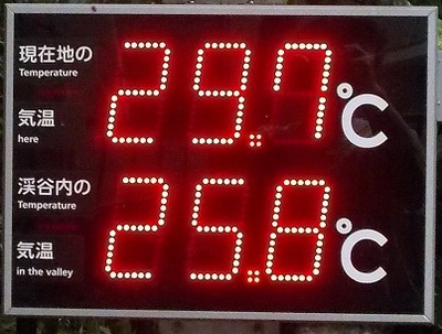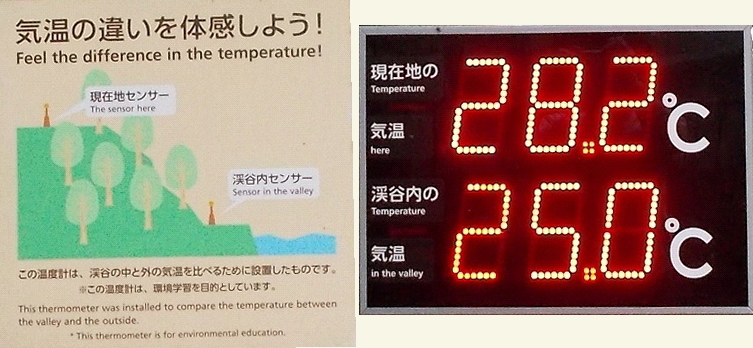 渓谷の入り口には温度計があった。ここの温度と渓谷の温度が比較表示されている。