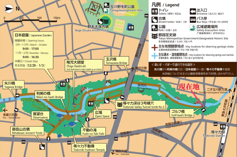 経路は、等々力駅−ゴルフ橋→渓谷橋→稚児大師堂→不動の滝→等々力不動尊→日本庭園→ゴルフ橋(へ戻る)→等々力駅 となっている。