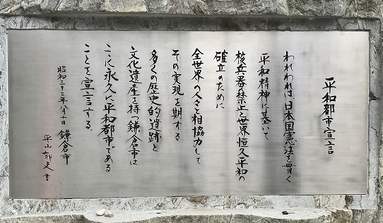 鎌倉市役所前バス停まで移動。途中画家の平山郁夫が書いた鎌倉市の平和都市宣言なるものが有り、
