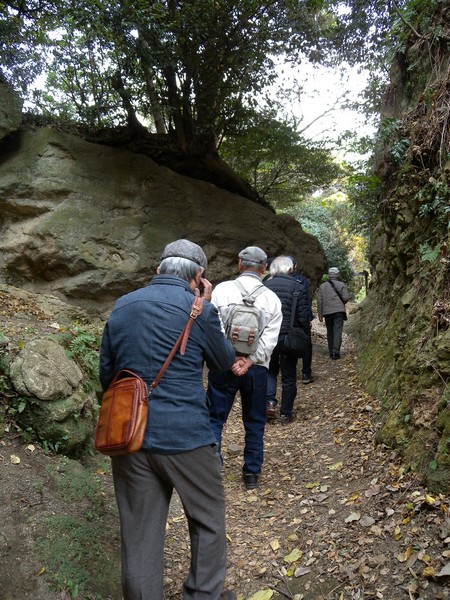 この切通はご存知、鎌倉から三浦半島方面を結ぶ道として鎌倉時代の重要な古道、落ち葉を踏みしめ、