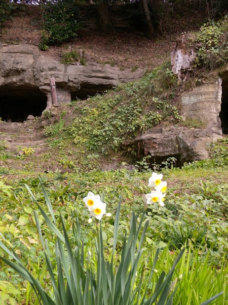 岩窟の前に咲く水仙