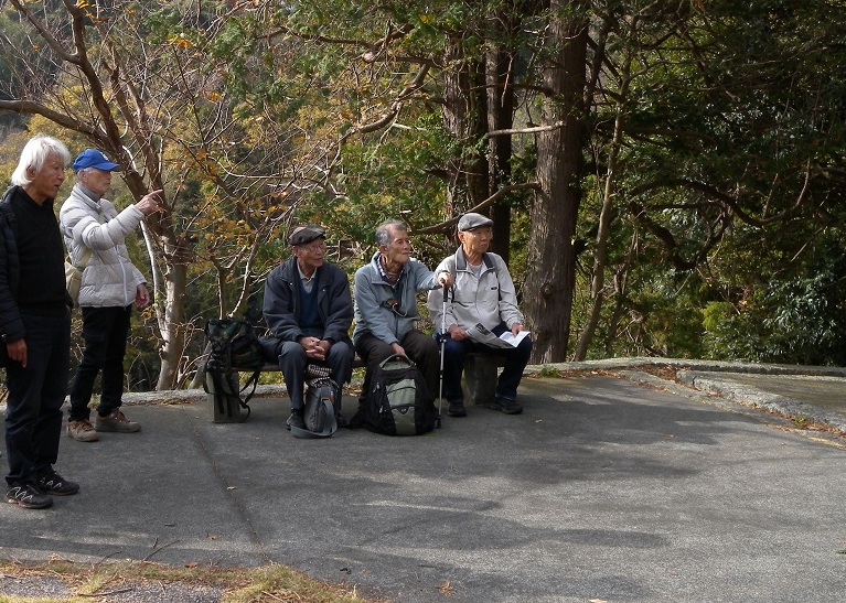 木造のベンチがあり “三匹のお猿さん”みたいに3人が腰を下ろした。一休みとなった。