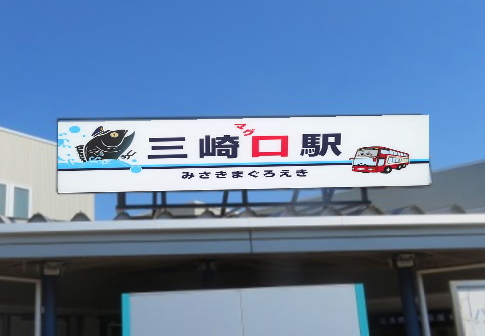 たしかに名物のマグロに引っかけて、「みさきぐち」駅ではなく「みさきまぐろえき」となっていて、マグロの絵が