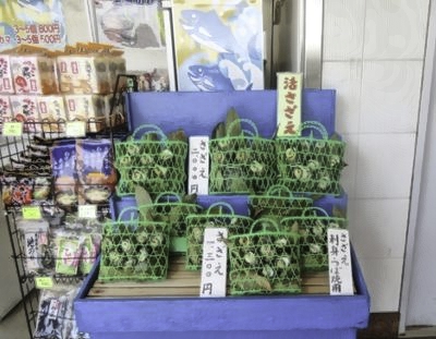 京浜急行 三崎口駅の看板 駅前土産屋の活きさざえ