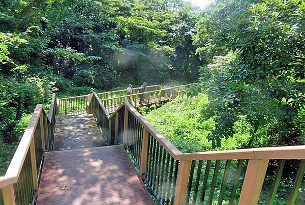 散策路は森の入り口から階段状に整備されており、河口に向けて下りとなっているが滑らない硬化樹脂製になっていて非常に歩き易いし、