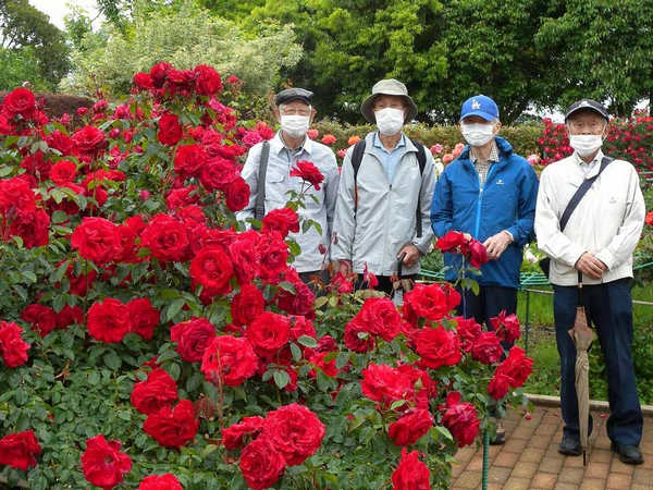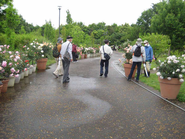 バラ園に入る(6)と、入口から咲き誇るバラが一杯、ここはまだ序の口と幹事が言う。
