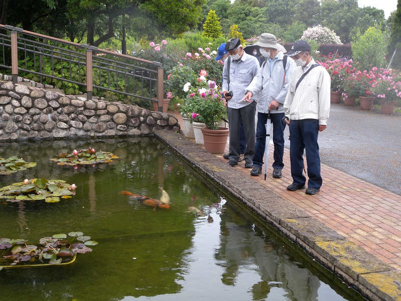 バラ園の中の池にはい大きな錦鯉が悠々と泳いでいる。蓮もあるようだ。