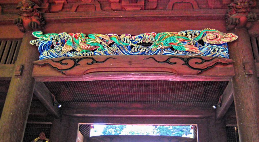 二天門の「龍の彫り物」を眺め、ここで記念撮影。龍も一緒に入れて撮りたいが難しい。