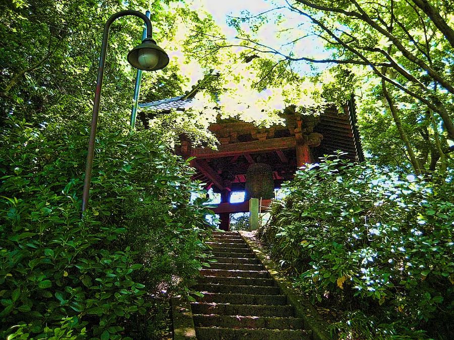 「絶景かな」とはいかないが、眼前に広がる新緑が眩しい。少し降ると深い緑の中に鐘楼がある。その佇まいは実に美しい。