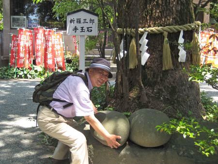 新羅三郎の手玉石に石塚さんが挑戦したが、手玉ではなく抱えるのがやっと。