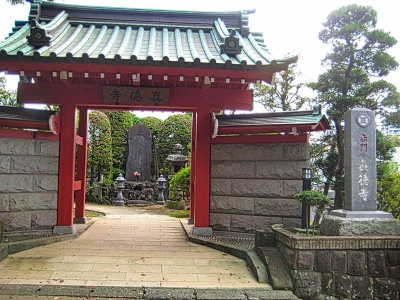 両側は桜並木で、春には桜のトンネルになるという。上る途中に赤門の真徳寺があった。どんな関係なのだろうか?