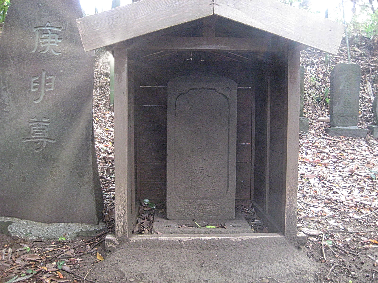 続いて、常光寺の裏手にある中横須賀公園の奥にある武蔵坊弁慶塚へ。常光寺からは行けないので、467号線(旧国道1号線?)の済美館の横を南へ入る。暫く歩くと少し開けた場所に出た。石段を登った奥に小さい塚がある。これが武蔵坊弁慶塚なのか。