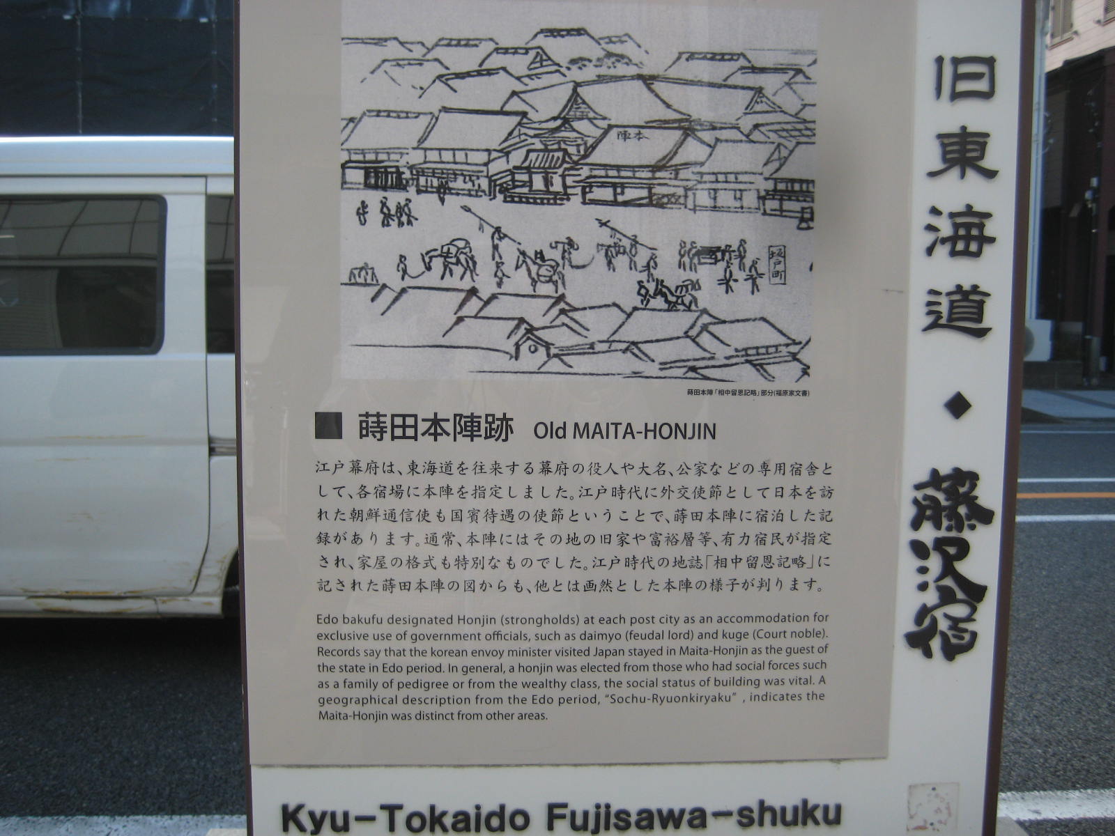 次は蒔田本陣跡へ。藤沢宿で唯一の本陣で、敷地400坪、建坪210坪、門構え庭園のある蒔田家の豪邸であったが、明治2年(1872年)に残念ながら消失した。今は小さな表示板があるのみで当時の面影は全くない。