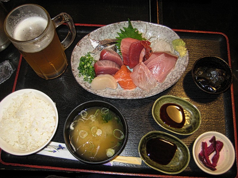 刺身定食とビールで2,400円(昨今のブームで400円値上げになっていた)。分厚い刺身2枚7種で食べ応えがあった。