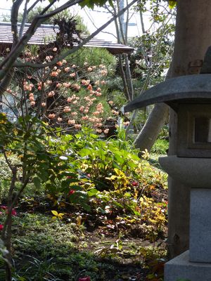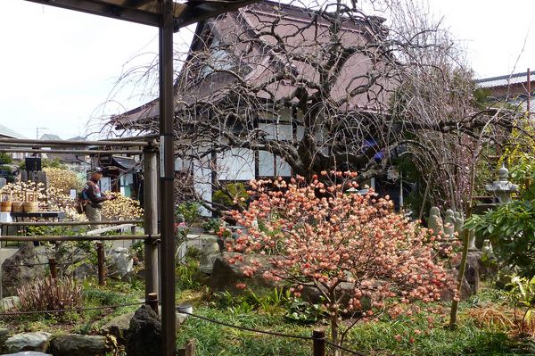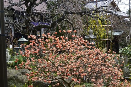 ミツマタだけでなく、花桃、椿、山茱萸、木瓜、雪柳、香港ツツジ、夏みかんなど数多くの植栽・河童の置物、狸の石像、筧、水琴窟などがあります。鉢植え、盆栽も数多く庭のあちこちに散りばめられています。住職のおもてなし、わかって欲しいとの心が伝わってくるように思えます。
