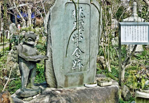 桃蹊学舎跡の石文横には二宮金次郎像が建っていますが、なぜか河童の姿をしています。