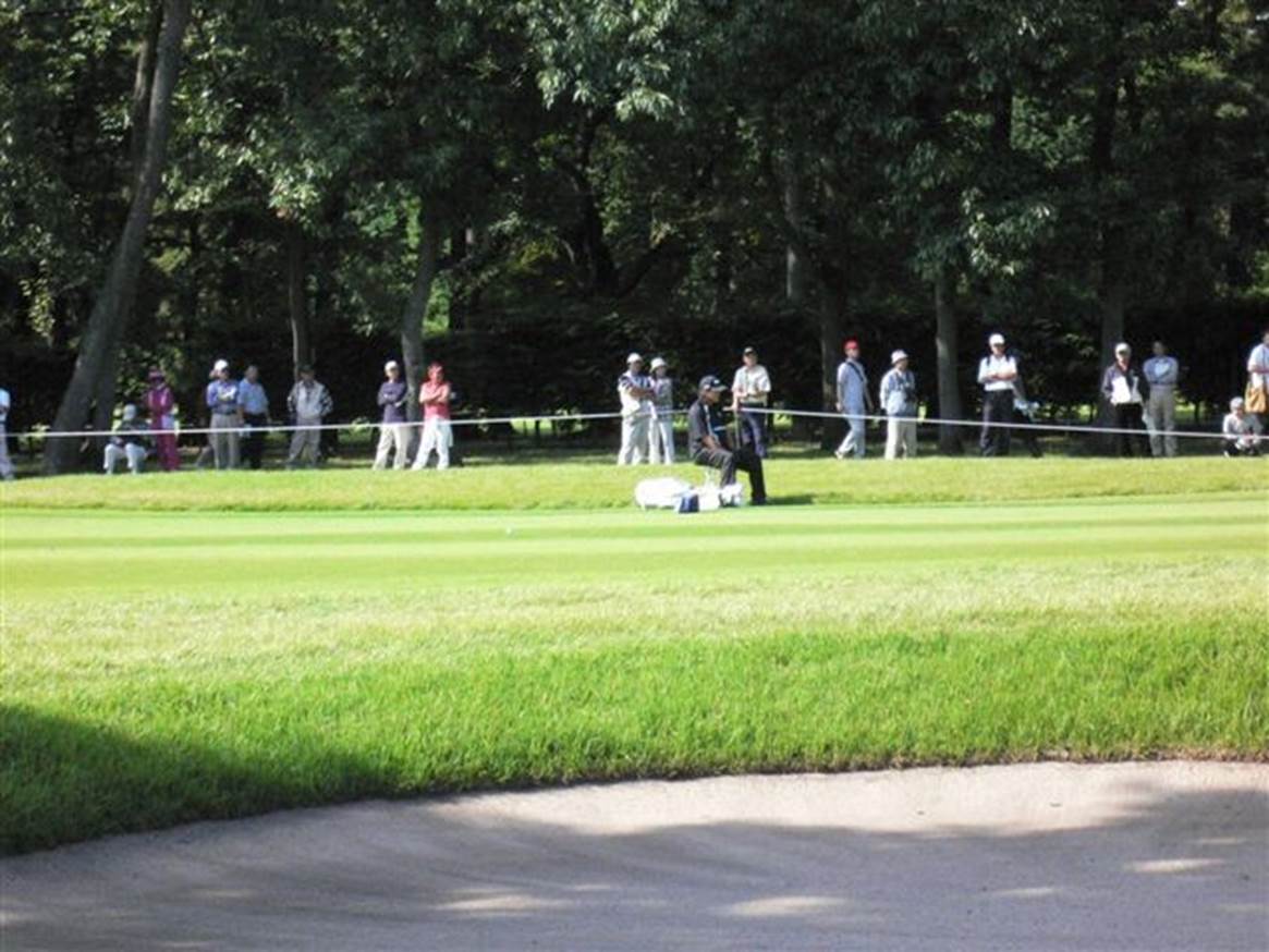 中嶋組が来た!中嶋はセカンドをバンカーに入れたが、バンカーからあわや入るかと言う見事なショットで何なくパー。王子はグリーン右に乗せ、10m くらいのバーディーパットを外す。暫くは中嶋組を追った。