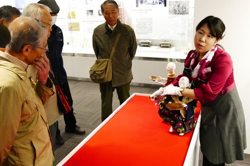 アテンダントに促され、からくり人形の実演が始まる。その動作は、センサーやマイコンソフトを駆使した現代のロボットも恥ずかしくなるような正確さであった。
