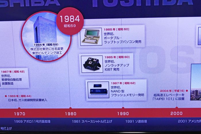 東芝が最初に生み出し世に送り出した製品を網羅した年表から東芝の歴史の説明に耳を傾ける。