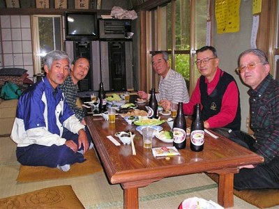 座敷のテーブルには「しいたけと野菜の煮付け」「サトイモの煮付け」「野菜&山菜の天麩羅」「お手製のお新香」等が並んでいる。これに会長が北海道から持参の「鮭とば」が加わる。