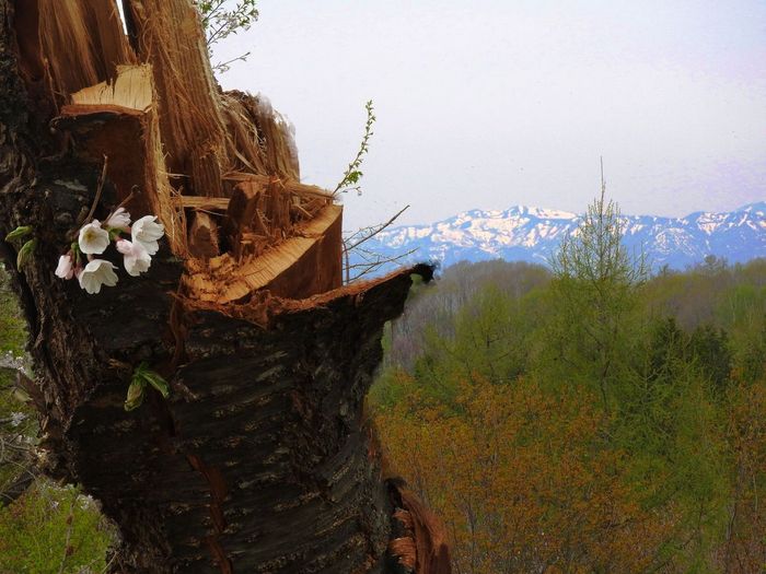 折れた幹の向こうには大雪山系の雪を頂いた山が見えた。この冬の間に、強風かはたまた豪雪がこの幹を