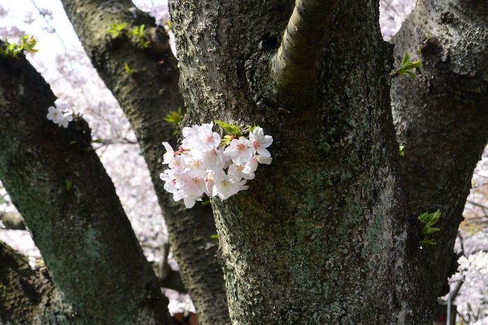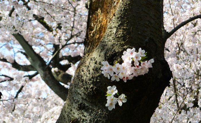 先日、横浜の三ツ池公園の桜を見て回っているうちに、幹から直接花が咲いている光景を目にした。