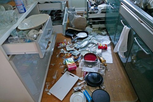 大半の引き出しは地震の揺れで開いていたが、中の皿などが外まで飛び出して割れたのは少なかった。
