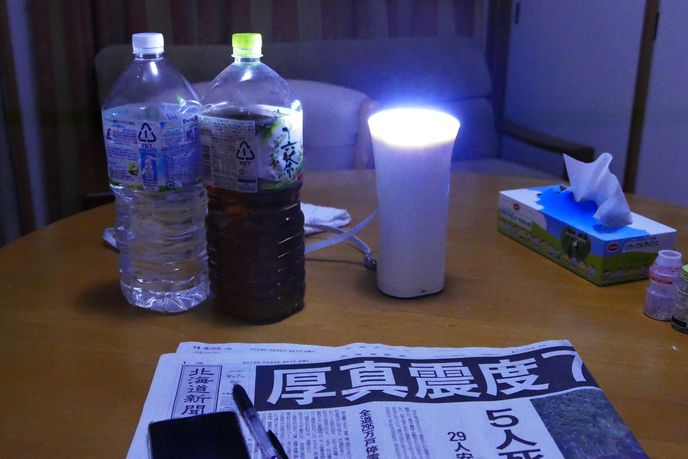 前回の地震での停電時にもっと電池が長持ちする海中電灯がないかと探していた。その後、LEDライトが普及し、連続点灯で50~70時間可能な東芝の製品が手に入るようになった。夕食後、これをテーブルの上に天井を向けて立て、照明の代わりにした。