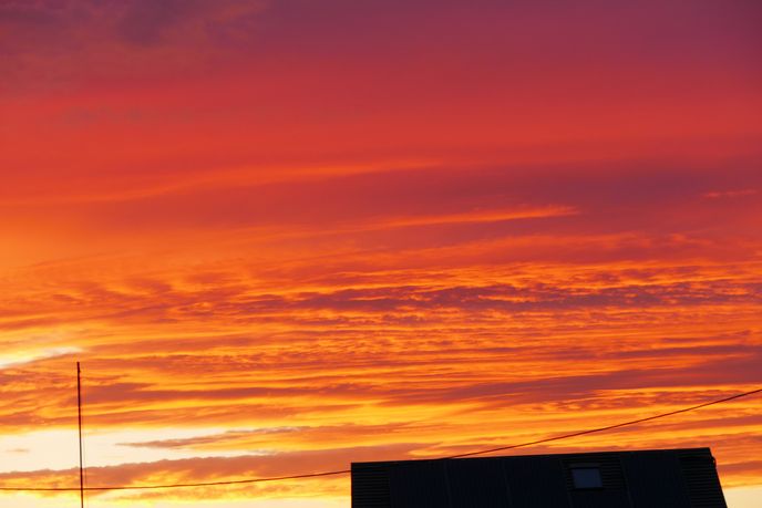 隣家の屋根越しに震源地の方向を眺めると、夕焼けが綺麗だ。気のせいか妖しい美しさだ。
