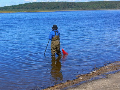 長節はちょうぶしと読む。湖に到着してみると、湖岸にはシジミ採りをしている数人の人がいるだけ。