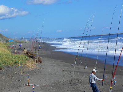 砂浜には鮭釣りの竿が林立している。近くの川に遡上するため回遊する鮭をねらっている釣り人達だ。