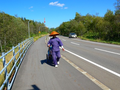「比叡山には千日回峰という荒行中の荒行があります。簡単には1000日で4万km、地球を一周以上歩きます。平均で一日十里、もっとも厳しい後半には一日十五里を歩かねばなりません。北海道は広いので、野宿のために簡単なテントを積んでおりますし、足もご覧のようにスニーカを履いてお ります。道もきれいに舗装されております。