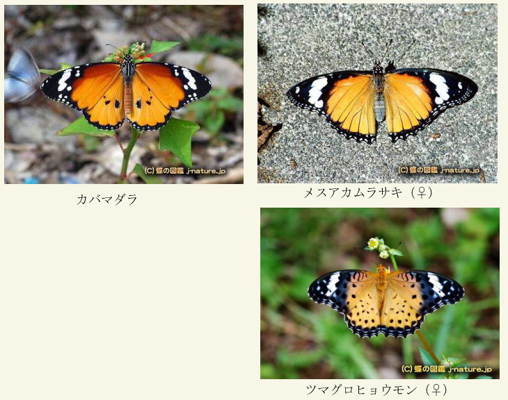同じ地域に生息するタテハチョウ科のメスアカムラサキとツマグロヒョウモンのメスは全く別種にかかわらずカバマダラに そっくりで、飛び方もマダラチョウ科を真似てゆっくり飛ぶ。