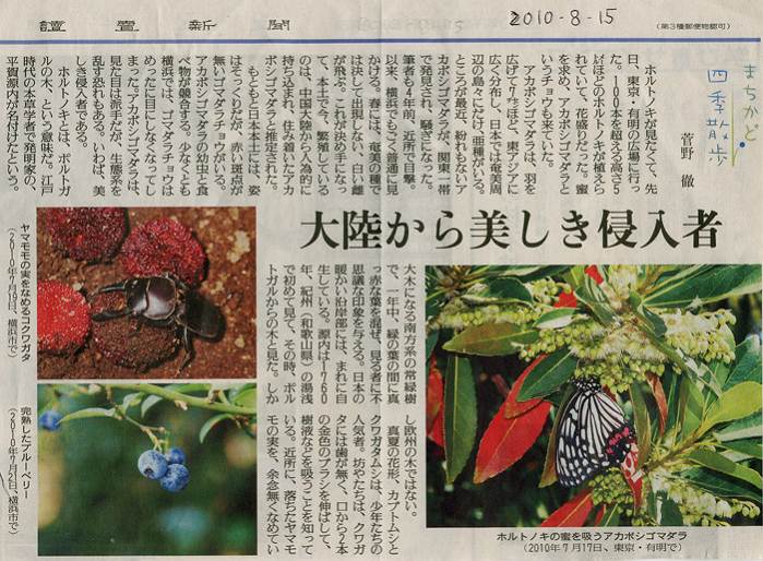 蝶の世界ではアカボシゴマダラが数年前に初めて発見されて以来、関東で急激に増え続けている。繁殖力が強く,幼虫の食 草が同じ在来種のゴマダラチョウが追いやられて問題になっている。