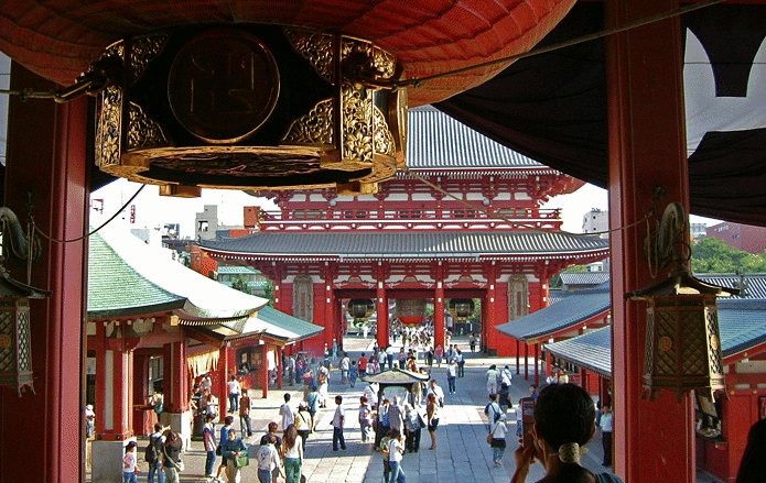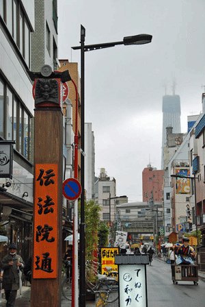 浅草寺は今平成大営繕の真っ最中で、従来の右の様な本堂は、すっぽりと覆われており、大きな龍(金龍山浅草寺が正式の名称)が描かれていた。新しくチタンの屋根瓦(72,000枚)になるそうで、ここにも最新技術・・。