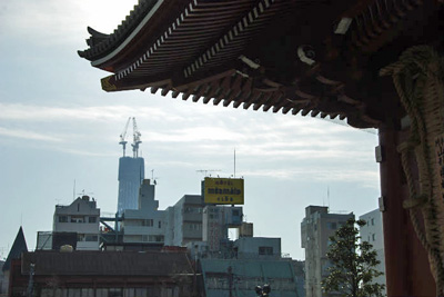 目を移すと宝蔵門の向こうに建設中の東京スカイツリーが見えたので、歩いて近くまで行ってみることにした。