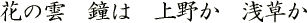 芭蕉の句は、桜の花が満開の辺りに響くゴ〜ンという鐘の音、其角の句は、辺り一面に漂う名物浅草のりの香りなど、凡人にはなんとなく解る。