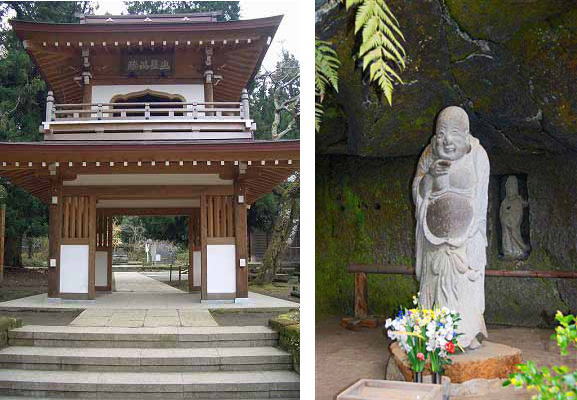 裏の洞窟に行くと等身大石像が祀られていた。弥勒菩薩の別の姿と言われる布袋尊である。