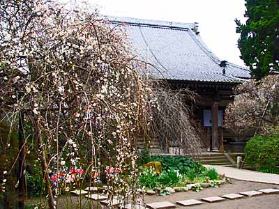 この日は境内の枝垂れ梅が七分咲きで見事であった。