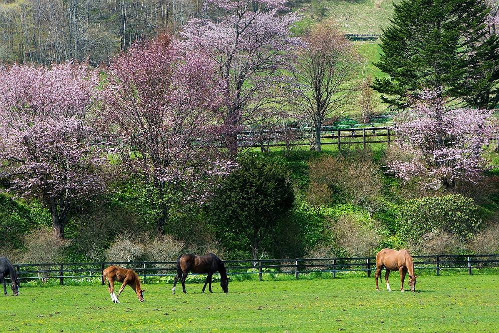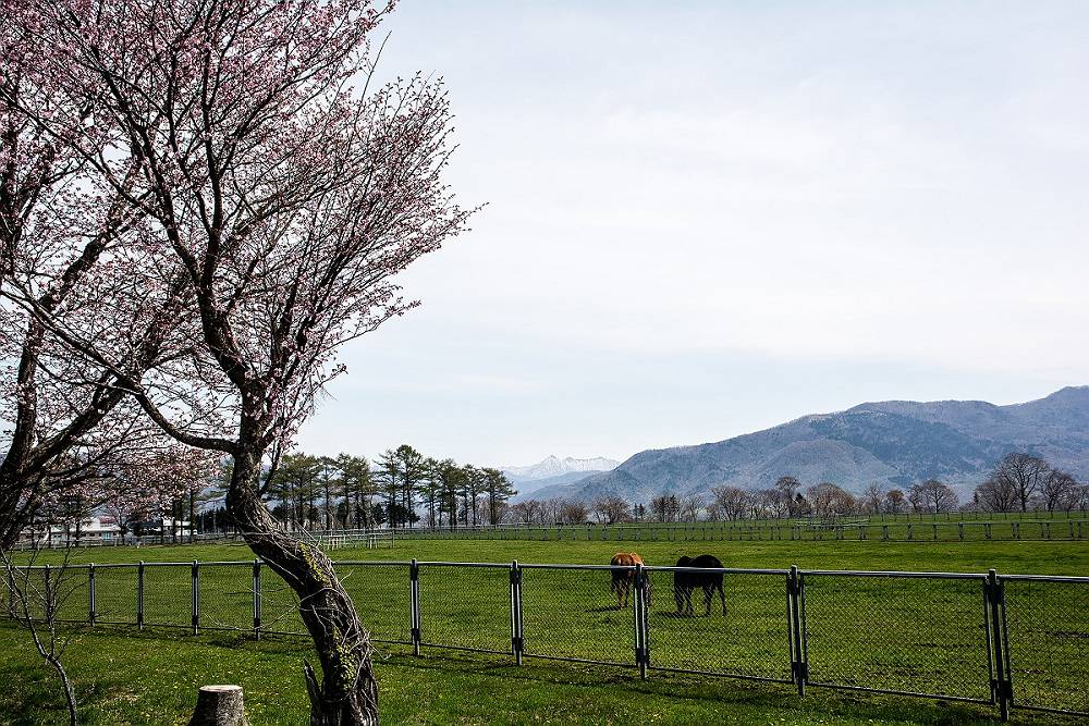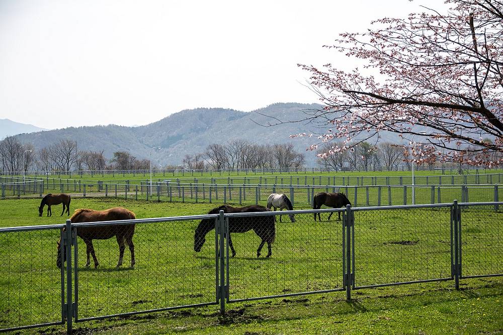 優駿ロードと呼ばれるように、ここも静内町と同様サラブレッド育成のための牧場に沿って桜が植えられています。