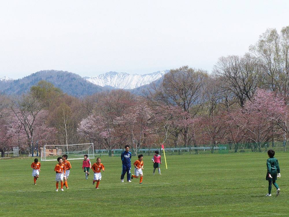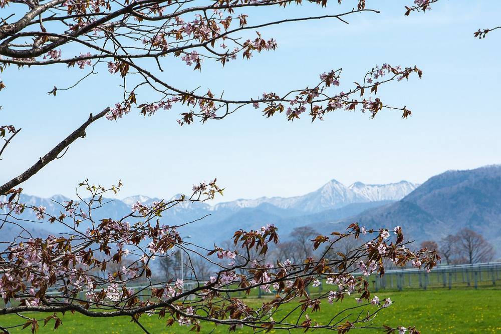 それに、日高山脈のすぐ近くなので、雪を頂いた冷厳な山々の姿が桜並木と重なるところが見所でもあります。