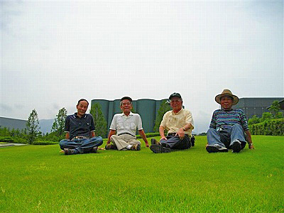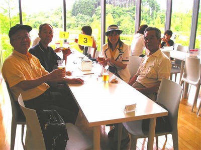 何と素晴らしい女性に巡り合ったものだ。親子連れ3人、若夫婦2人と我々オジン4人の「特別グループ編成」で工場見学が始まった。中村さんの説明は、これまた天下一品でした。進藤君と善ちゃんが意地悪な質問をしても、ものの見事に解答を呉れる。4人は彼女にすっかり惚れ込んでしまった。一刻も早く飲みたいビールを我慢して、フルコースの工場見学をした。11:30 漸く「試飲ホール」にたどり着いた。先ずは出来立ての「アサヒスーパードライ」で乾杯!次に「黒ビール」、「新発売プライムタイム」、どちらも喉越しがいい。最後にレストランでしか飲めないと言う「熟成ビール」を飲んでいい気分!酔いがまわって工場前の芝生に4人とも寝転ぶ。