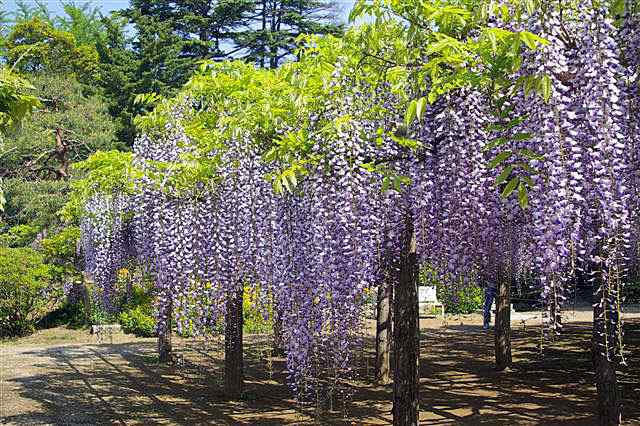 東武野田線の藤の牛島駅から歩くこと約10分でめざす藤花園に到着(9時頃)。入口からすぐ前にある藤棚には既に8分咲き以上で艶やかな房をたれ下げている。すばらしい。