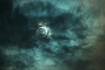 7時30分、厚い雨雲に切れ目が出来た。ちょうどその切れ目に太陽が見えた。部分的に切れてはいるが「金環」だ。7時34分、定刻「完全な金環」が見えた。真円になった時、リングの美しさは最高に達した。これは“奇跡”だ。流れる雲に時々消される「金環」は何と神秘的な事か。これが平安朝の人たちも見たであろう「金環日食」か! 感動した!