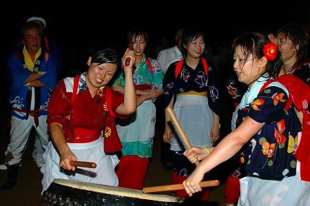また、小学校のグランドに集結した時、休憩があった。その休憩中に娘さん達が交代で太鼓を上手に叩くのにびっくりした。