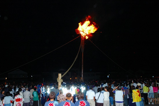 浜では、大松明2基に火が付けられクライマックスを迎える。各キリコを担ぐ若い衆が松明の頂上に立て