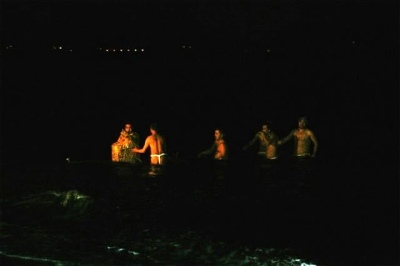 7時少し前に石塚家を石塚家族全員と浜辺に向かって出発です。浜辺に着くと同時にどんど焼きに火が付きました。急いでシャッターを切りました。