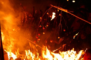 この火で焼いたお餅を食べて無病息災を祈願するのですが、お餅の焼き方にも伝統があります。木の枝の先の赤と黄色と緑のお餅をくっ付けます。