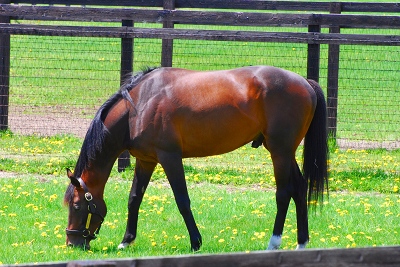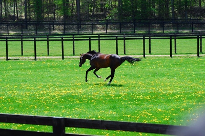 私は専門家でないのでよく分かりませんが、もうトレーニングはしていないと思うのですが、ディープインパクトの体は新緑の中で輝き、とても元気そうでした。